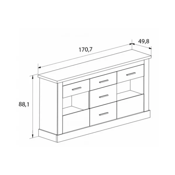 Aparador compuesto por tres cajones y dos puertas de cristal, con un marco perimetral de color cambrian que guarda una original línea moderna. Este producto es ideal para combinar con cualquier mueble de la serie Chellén o para llenar ese rincón que tienes vacío en casa donde necesitas un extra para guardar a la vez que decorar.