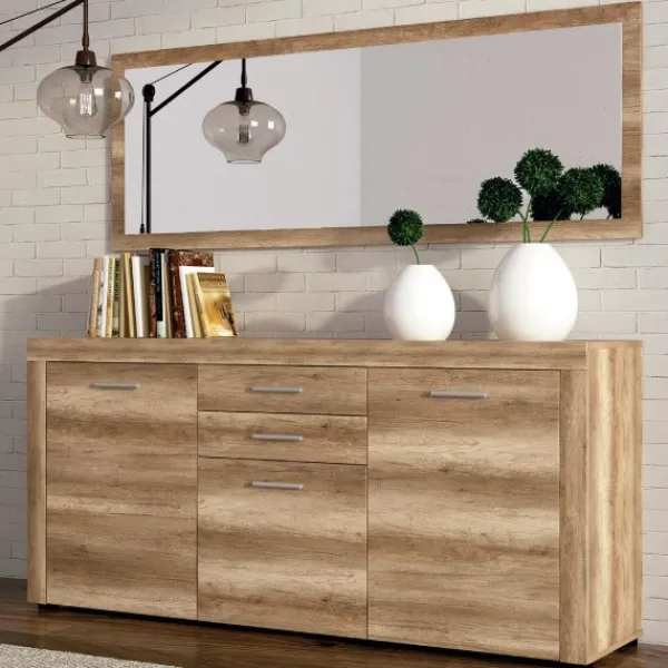 Conjunto de aparador con espejo en color cañón. Compuesto por un marco con espejo y un aparador en color cañón. Perfecto para combinarlo en tu salón con los muebles modelo Texas, así como la mesa Corfu extensible de comedor y las sillas Sakura. Este producto es un mueble kit.