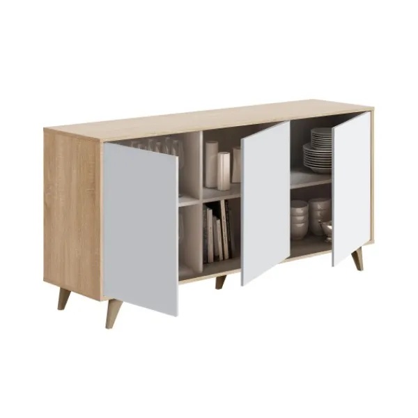 Aparador de tres puertas modelo Relax Plus. Mide 154cm de ancho y es de color roble canadian y blanco artik. Puedes completar tu pedido con otros artículos del mismo color que encontrarás en nuestra web. Mueble KIT.