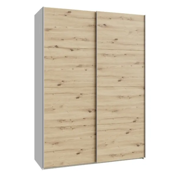 Armario de 150cm de dos puertas correderas disponible en color roble artisan. Cómodo, práctico, funcional y perfecto para cualquier rincón. Destaca por su originalidad en las puertas, ya que las dos piezas centrales se pueden cambiar, dejando todo en roble artisan o mezclando con blanco como aparece en la imagen. En su interior podrás ver una balda y una barra de colgar. Mueble KIT.