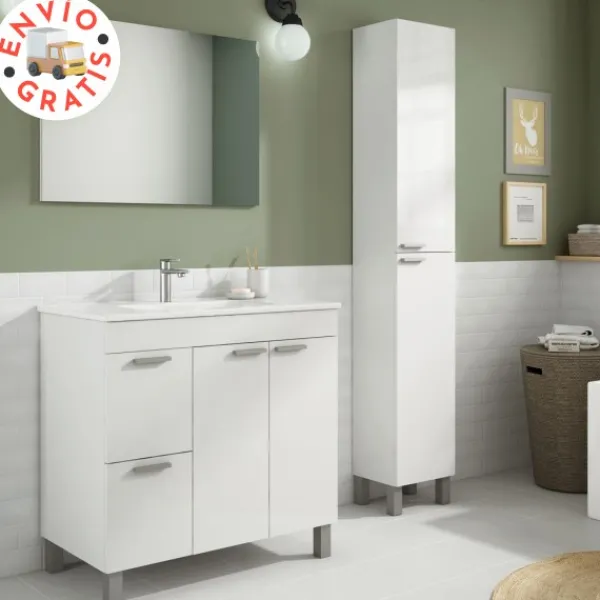 Baño modelo Aktiva con un lavabo encastrado, mueble para el lavabo con patas y un espejo del mismo acabado. Solo disponible en un color: blanco brillo, que hará buena combinación con cualquier otro color que le pongas. A un buen precio podrás tener un baño bonito y completo. ENVÍO GRATUITO.