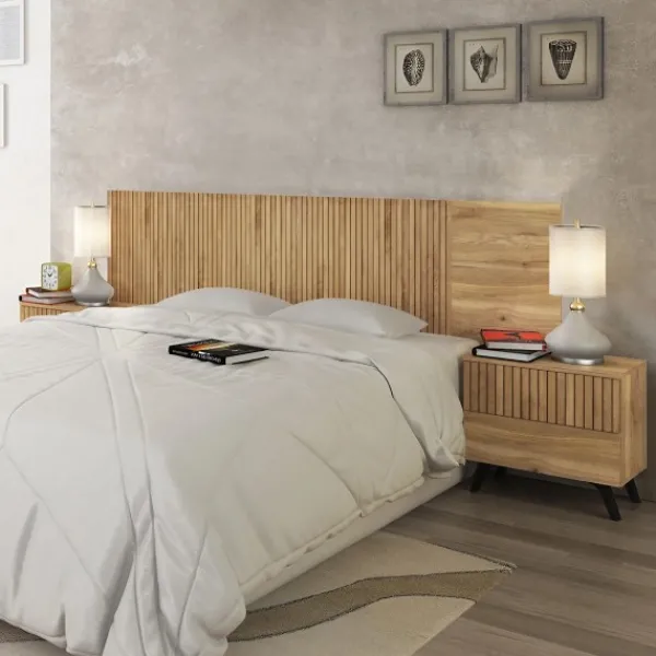 La combinación ideal te espera aquí. El conjunto Solana incluye cabecero de matrimonio de 210cm y dos mesitas de noche de dos cajones. Es una opción moderna, versátil, práctica, moderna y completa, que le dará un toque original y cálido a su hogar. Las mesitas de noche incluyen patas altas que le dan un toque diferente y facilitan la limpieza. Se fabrica en color mauvella – rayas. Mueble KIT.