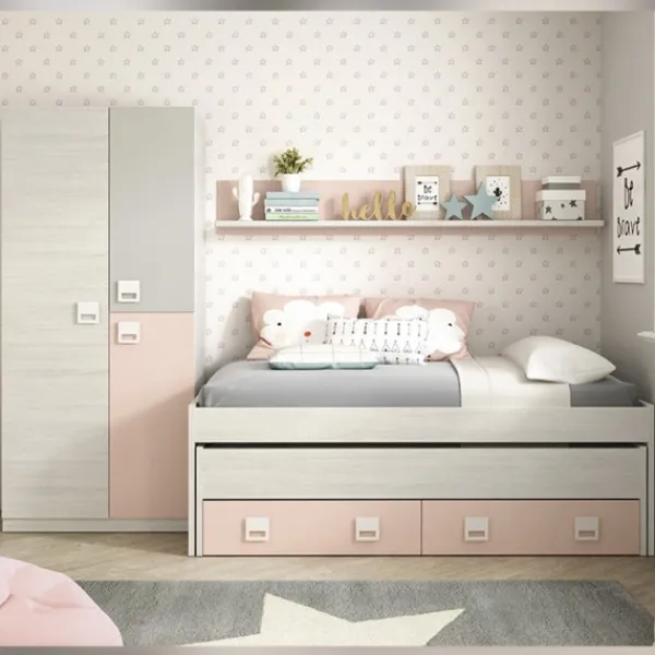 El dormitorio soñado para tu niña. Así es este dormitorio juvenil COMPLETO compuesto por un increíble armario de tres puertas, una cama compacta doble con cajones y un estante con respaldo. La combinación de colores es perfecta para crear el ambiente ideal de los pequeños. Formato KIT.