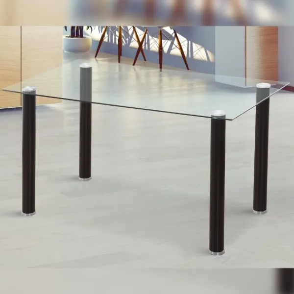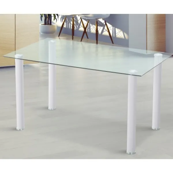 Mesa de comedor fija rectangular con tapa de cristal templado transparente de 8 mm y patas de tubo de acero pintado de color negro o blanco.