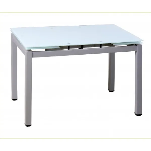 Mesa de comedor extensible rectangular con tapa de cristal templado blanco y patas metálicas pintadas de color gris.