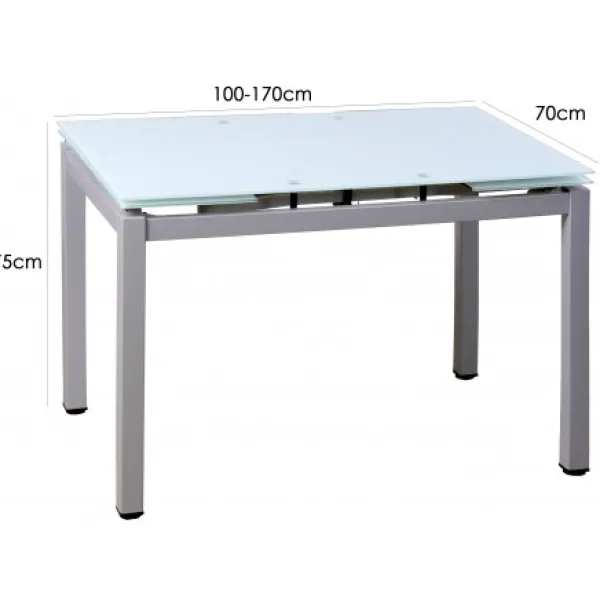 La mesa de cocina modelo 70 se caracteriza por ser práctica y útil a un precio muy bajo. Su diseño elegante en color blanco y sus dos extensibles convierten a esta mesa en el modelo perfecto para todas las cocinas. La tapa está fabricada en cristal templado color blanco y la estructura tiene las patas metálicas con pintura electrostática. Se puede combinar el taburete mod. 10 y la silla mod. 20.