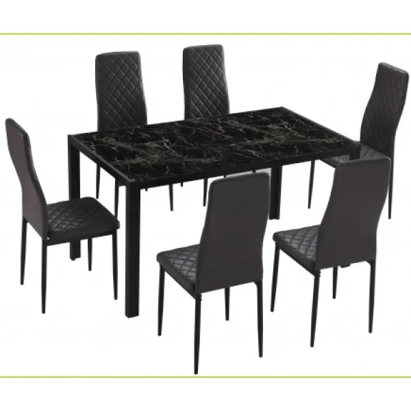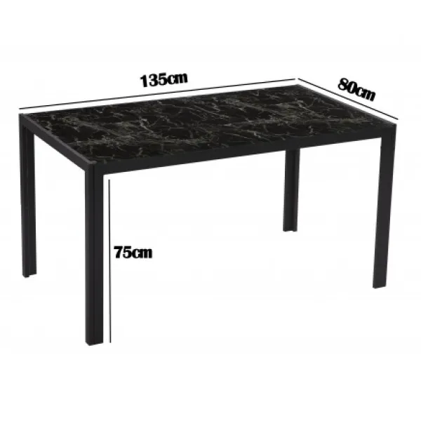 Mesa de comedor fija rectangular con tapa de cristal templado con un estampado que simula el mármol y patas de tubo de metal con recubrimiento en polvo de color negro.