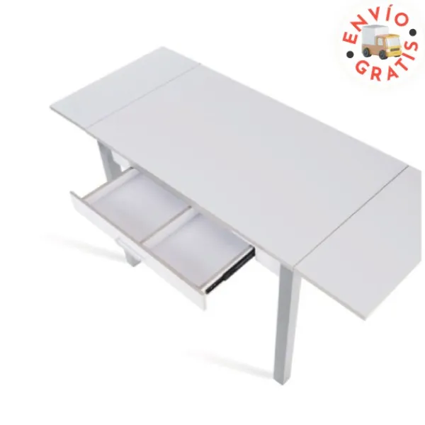 Mesa rectangular extensible de 80cm, perfecta para aprovechar pequeños espacios. Disponible en color blanco. Con cajón doble. ENVÍO GRATIS