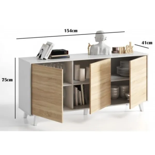 Sus patas altas y sus líneas rectas lo convierten en un mueble de marcado estilo vintage combinado con el emergente estilo nórdico. Terminado en una combinación de color madera de roble con un fabuloso blanco brillo, que será la joya de su casa.