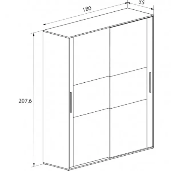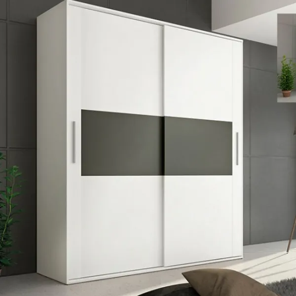 Armario 2 puertas correderas en color blanco con franja frontal en color grafito. Contiene 2 barras para colgar y 2 estantes superiores. Formato KIT. Se puede comprar cajonera opcional aparte.