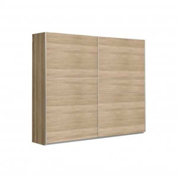 Armario de 220cm con puertas correderas de color roble. Lo diferente que podrás observar en éste armario es la franja reversible que tiene, puedes ponerla de color roble o blanco según te guste. En su interior tiene una balda y una barra de colgar. Puedes adquirir la cajonera del mismo modelo o un set de 3 baldas para añadir un hueco de almacenaje en tu armario. Mueble KIT.