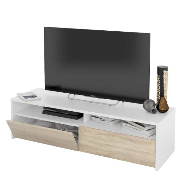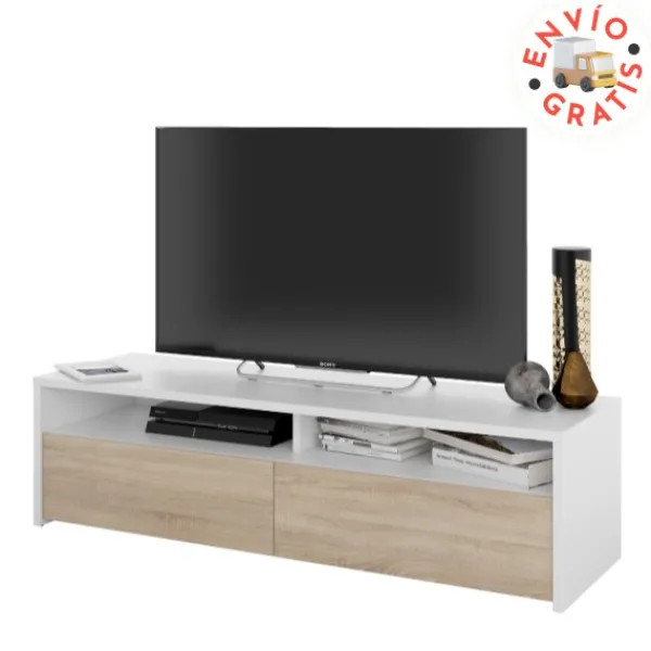 Mueble bajo de televisión Tokio de 130cm, que tiene dos puertas y dos huecos. Un modelo elegante, funcional, sencillo y práctico. En color blanco artik y roble canadian. Mueble kit. ENVÍO GRATIS