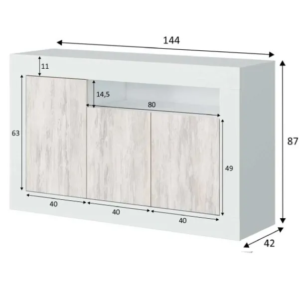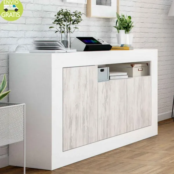 Aparador modelo Velho. Tiene tres puertas, un estante en cada lado y un hueco en la parte superior. Combina dos tonos diferentes de blanco, blanco velho y blanco artik. Le dará un toque chulo allí donde la pongas. Puedes completar tu pedido con el resto de artículos de la serie Velho. Envío GRATIS. Tipo KIT.