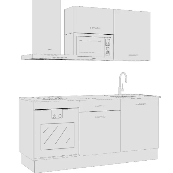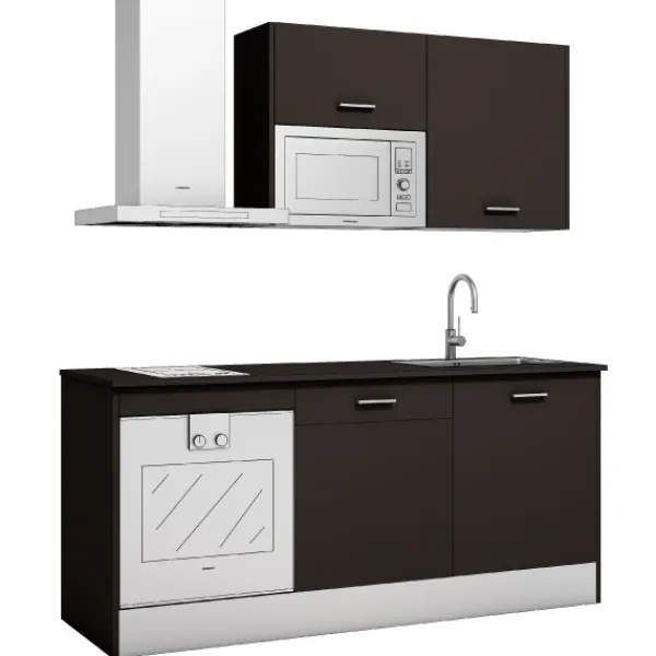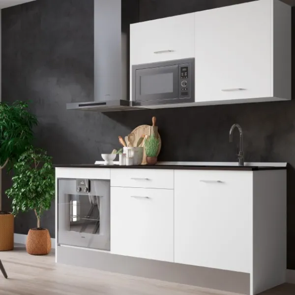 La cocina Export N1 de 180cm es un modelo compacto, básico, práctico y sencillo. Se compone de tres módulos diferentes, un bajo y dos alto para compensar su diseño y funcionalidad.