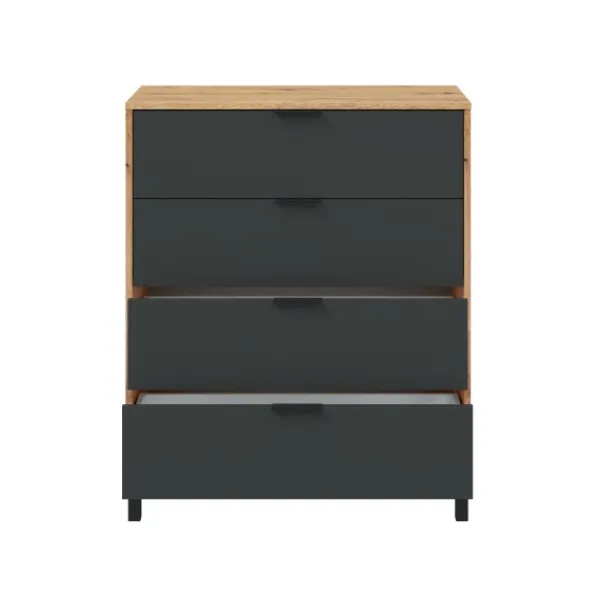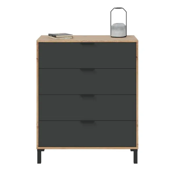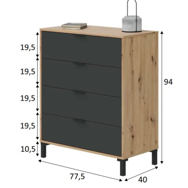 Una cómoda perfecta para completar tu dormitorio. La cómoda Enzo tiene 4 cajones y patas altas, que dan un toque a tu habitación y facilita realizar la limpieza del suelo. Puede encontrar el cabecero y las mesitas a juego en la web. ENVÍO GRATIS.