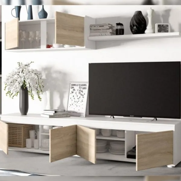Composición única de salón 200 cm en color blanco artik-roble canadian. Pequeña y elegante. Formato KIT. Fácil montaje.