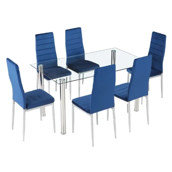 El conjunto ideal y económico más completo, ya que incluye una mesa fija de cristal y un conjunto de 6 sillas color azul.