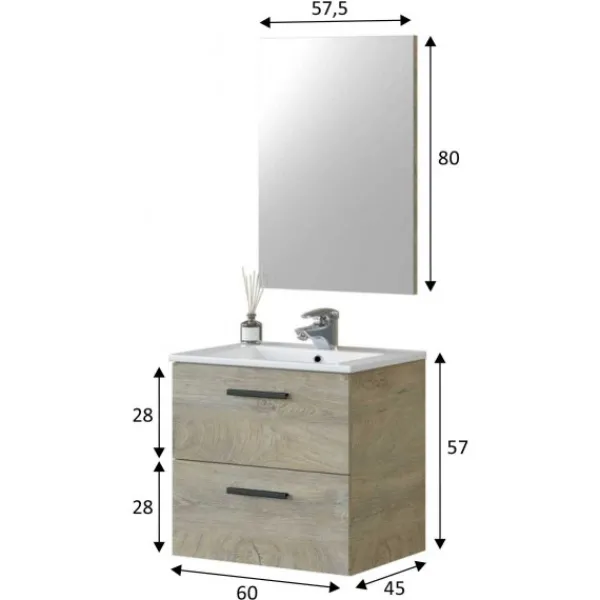 Conjunto de baño modelo Noa. Se compone de un mueble de dos cajones con lavabo y un espejo. Es de color roble alaska. Incluye todo lo necesario para fijarlo a la pared. Puedes combinarlo con la columna ATENEA y completar tu baño. Tipo KIT.
