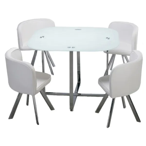 Conjunto económico y moderno de mesa de cristal + 4 sillas. Un modelo ideal para tu salón o tu cocina. Disponible en color blanco