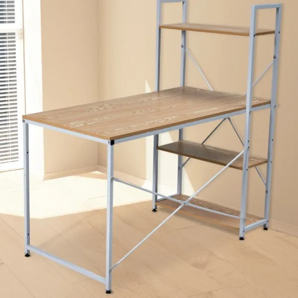 Escritorio con estantería modelo Dobby. Una opción muy funcional ya que tendrás a mano cualquier cosa que tengas en la estantería. Además ahorras espacio, la mejor opción. Su estructura es de color gris y las tapas de madera.