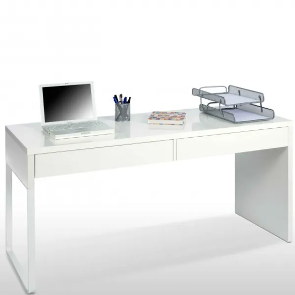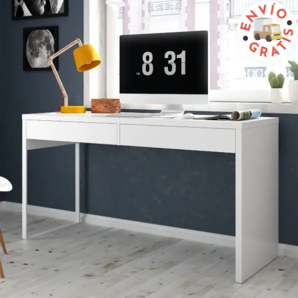 Mesa de ordenador modelo Bianca. Tiene cada pata con un diseño diferente para que la coloques de un lado o de otro ya que es reversible. Su color es blanco artik por lo que puedes combinarla con muchos artículos de nuestra web. Además incluye dos cajones en su estructura donde almacenar lo que necesites. Tipo KIT.