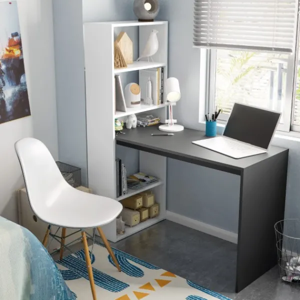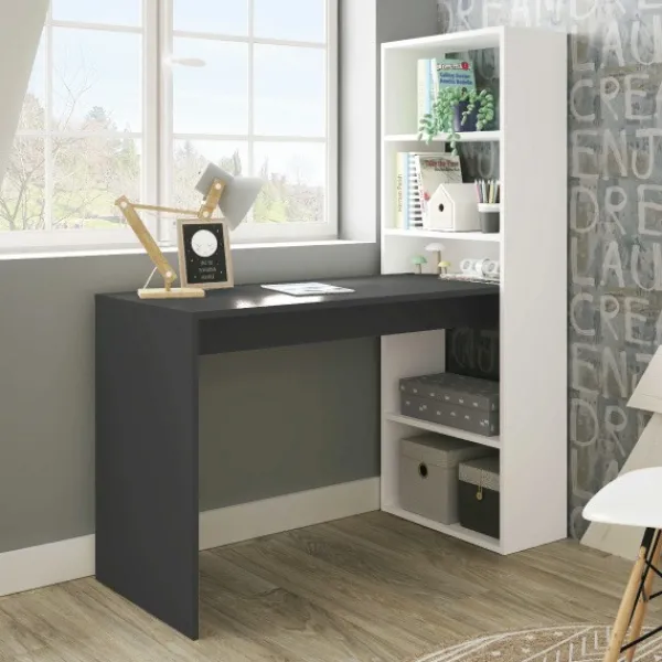 Si buscas optimizar espacio y tener un extra donde colocar todo lo que necesitas aquí te traemos la mesa de estudio + estantería modelo Gio Plus. Es de color blanco artik y gris antracita, reversible con estantería y con 5 huecos. Mueble KIT. ENVÍO GRATIS.
