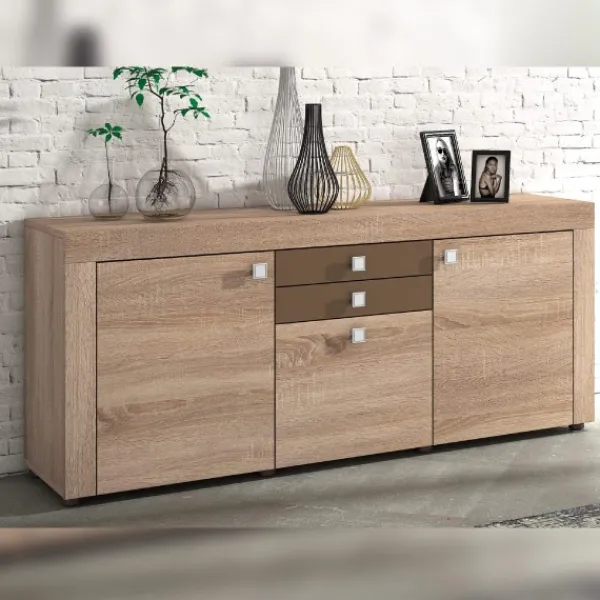Aparador mueble ideal para colocar todo lo referente para disfrutar de tus comidas en el salón-comedor. El aparador Julieta tiene tres puerta y dos cajones. Combina con la composición de salón Julieta.