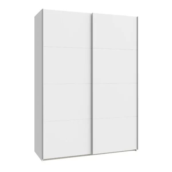 Armario de150cm de dos puertas correderas disponible en color blanco mate. Cómodo, práctico, funcional y perfecto para cualquier rincón. En su interior podrás ver una balda y una barra de colgar. Mueble KIT.
