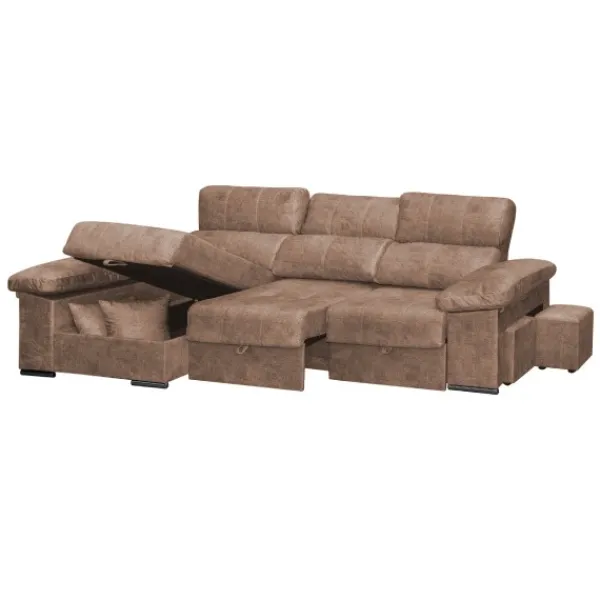 El chaiselongue cama Roma de 282cm está tapizado en tela magnol piedra. Con arcón, respaldos reclinables y asientos extraíbles XL. Diferentes tapizados y colores disponibles en la web.