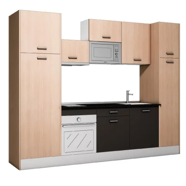 La cocina Export N2 de 280cm, es un conjunto muy completo, con un diseño sencillo pero muy funcional y con gran cantidad de almacenaje. Compuesto con diferentes módulos no incluye electrodomésticos, grifos, fregadero ni costados verticales.