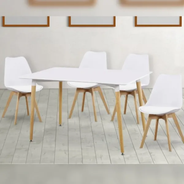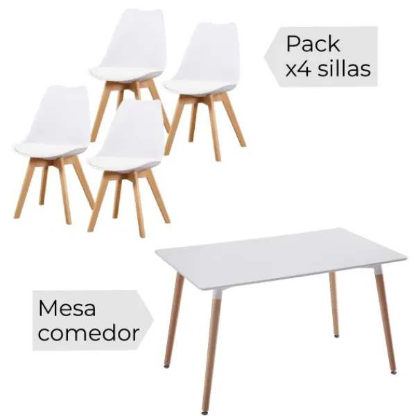El conjunto de diseño económico. Incluye la mesa de comedor fija modelo Dinamarca en color blanco y el juego de 4 sillas modelo Fina que se puede elegir en gris o blanco. Un estilo precioso que combina y completa cualquier salón.