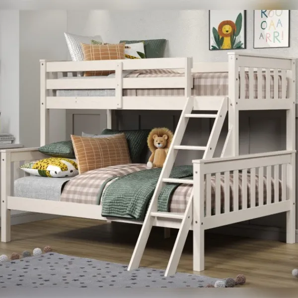 La litera de madera oxford más especial gracias a que combina una cama de 135x190cm en la parte inferior y una cama de 90x190cm en la parte superior. Es una litera resistente y de calidad, fabricada en madera de pino y DM. Disponible en dos colores: blanco decapé o blanco lacado. Es reversible y se puede montar la escalera a izquierda o derecha, para adaptarse a la perfección a todos los espacios. Una opción ideal para viviendas vacacionales o dormitorios de espacio reducido.