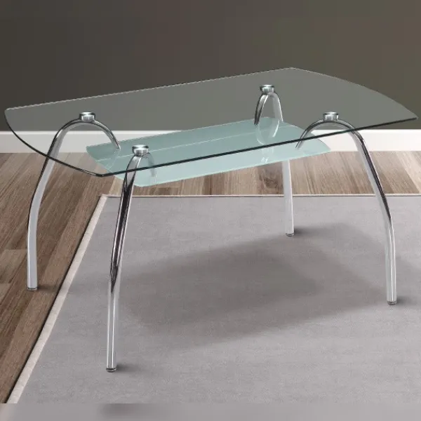 Mesa comedor fija rectangular con tapa de cristal templado transparente, tiene un bajo bandeja de cristal templado ahumado y patas metálicas cromadas.