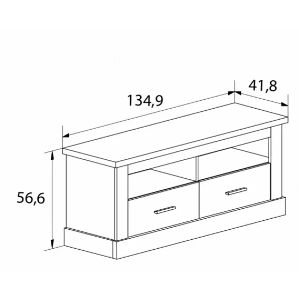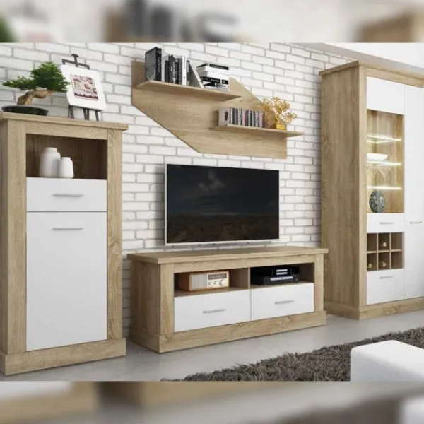 Composición de salón de color cambria-blanco compuesta por un bajo TV de dos cajones y huecos, una vitrina baja, un respaldo achaflanado con dos estantes y un bodeguero. Mueble KIT.