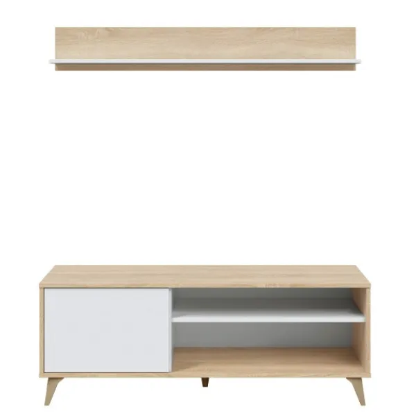 Disfruta del salón completo, con todo lo necesario para que quede perfecto. Incluye el salón con el bajo de televisión y el estante, el aparador y la vitrina. Todo a un precio brutal y un diseño increíble. De color roble canadian y blanco artik. Mueble KIT.