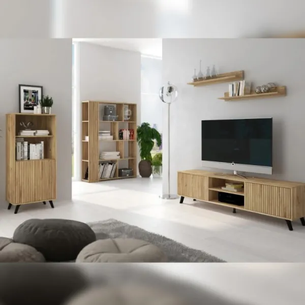 Salón completo solana 02 implica combinación perfecta para su salón donde incluye los muebles necesarios para el almacenaje de este espacio. Cuenta con mueble bajo TV, dos estantes, estantería y mueble bar. Disponible en color mauvella – rayas. Mueble KIT.