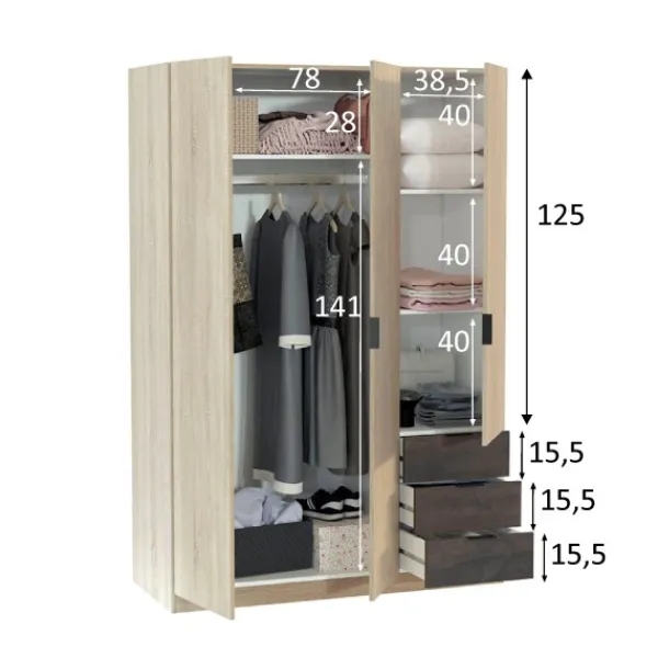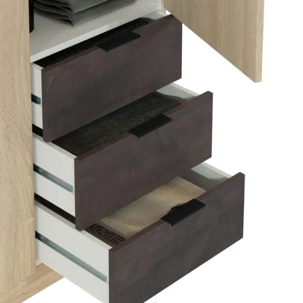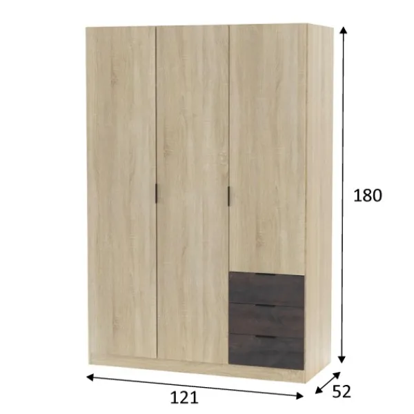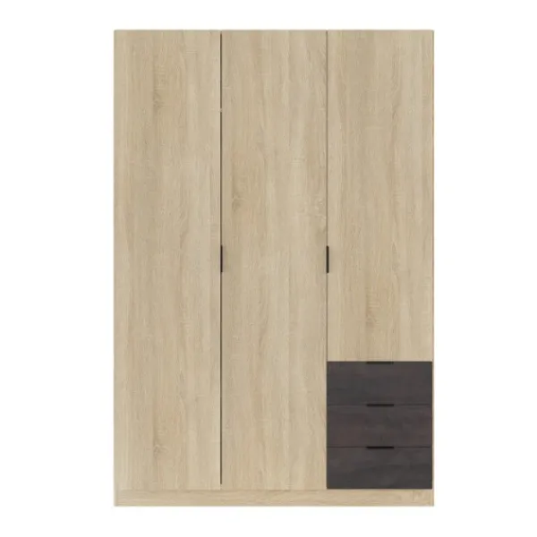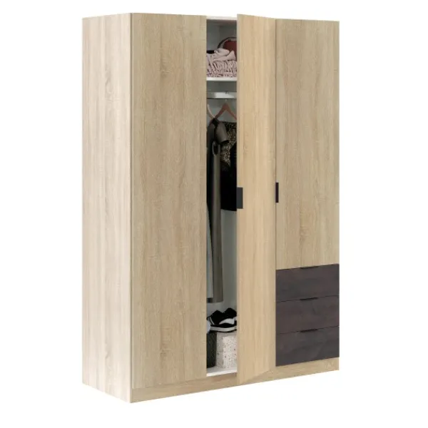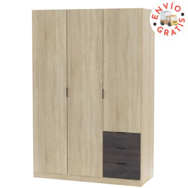 Este armario mide 121cm de 3 puertas y 3 cajones es un modelo comodísimo, práctico y funcional. Combina a la perfección en cualquier habitación gracias a sus tonos roble- óxido. ENVÍO GRATIS