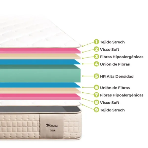 El Modelo Marcos completa la serie de colchones exclusivos de Muebles 1 Click. Destaca por su firmeza, manteniendo a la perfección la independencia de lechos, garantizando el descanso de los dos durmientes durante toda la noche.