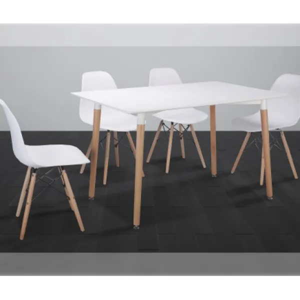 Mesa de comedor fija rectangular con tapa de DM pintado en blanco mate. Las patas son de madera maciza.