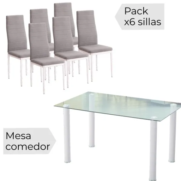 Económico y moderno conjunto de mesa cristal + seis sillas disponibles con patas en color blanco. Diseño y confort para tu salón.