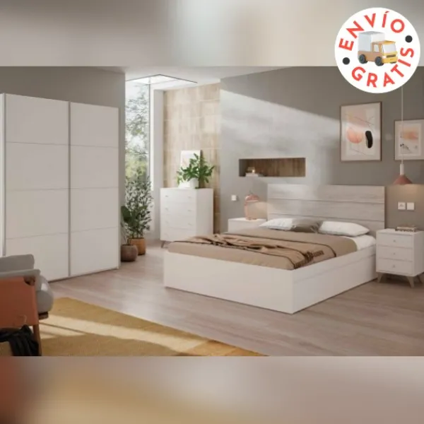 Dormitorio de matrimonio perfecto para habitaciones de 1º viviendas. Con un diseño actual, y un colorido moderno. Compuesto por cabecero , dos mesitas, una cómoda de 4 cajones y un armario. Formato KIT. Fácil montaje.