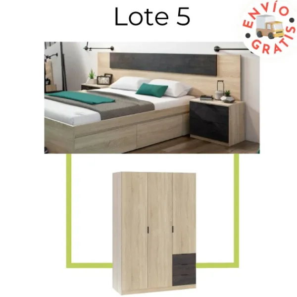 El lote muebles 05 Express tiene todo lo bueno: el diseño, la calidad, el ENVÍO GRATIS y rápido, pero sobre todo el precio. Incluye el cabecero, las dos mesitas de noche y el armario de tres puertas en roble – óxido. ENVÍO GRATIS