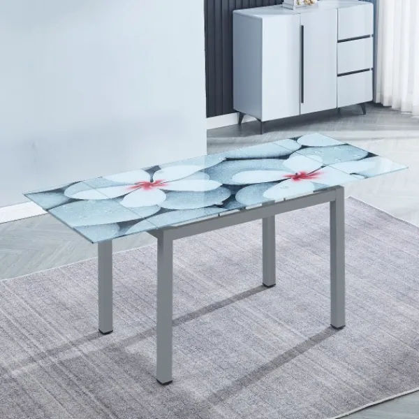 Disfruta de una mesa de cocina con un estampado diferente y original. Este modelo es extensible siendo la mesa de 100 o 170cm con la tapa de cristal con estampado de flores y las patas en color gris. Podrá encontrar en conjunto en la web con las sillas 20.