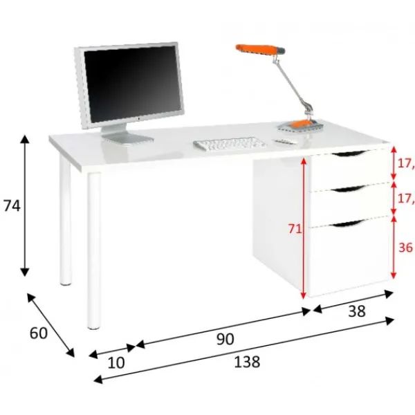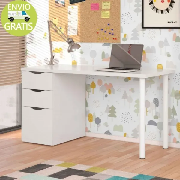 Mesa de despacho modelo Athena. Incluye un bajo de dos cajones y una puerta muy útiles para almacenar todo lo que necesites. Es de color blanco artik y reversible. ENVÍO GRATIS