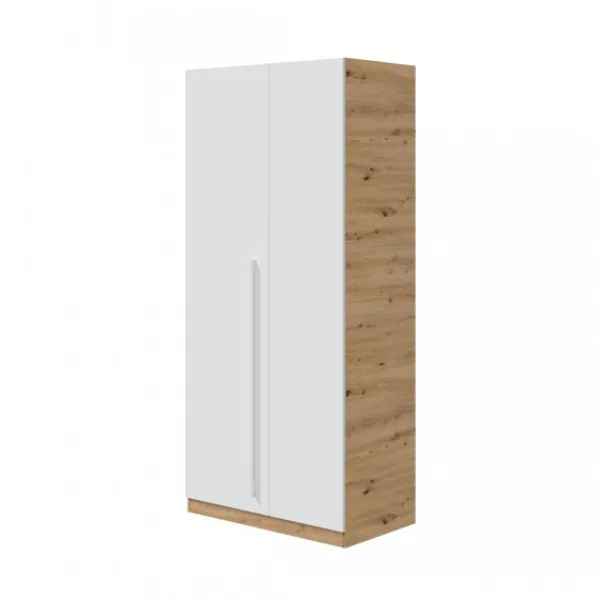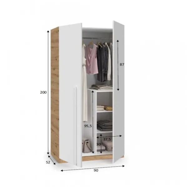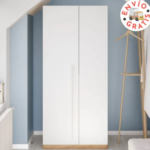 Armario de 2 puertas con barra de colgar y tres estantes en su interior. Mide 90 cm de ancho. Sus colores son blanco-artik y roble-Nodi. Mueble KIT. ENVÍO GRATIS