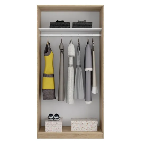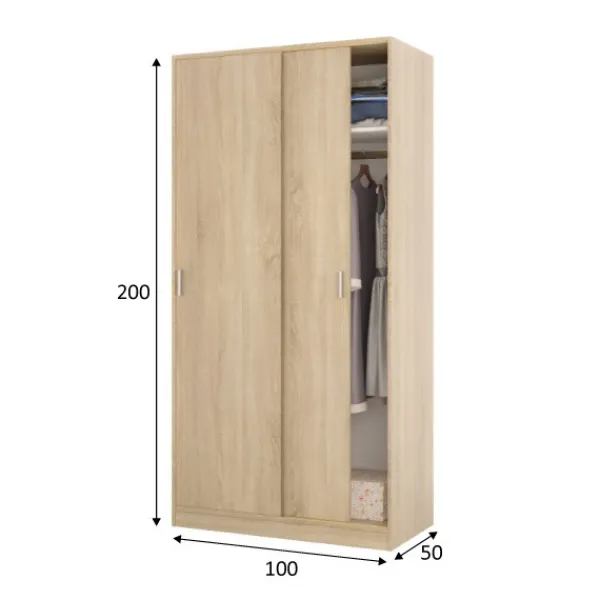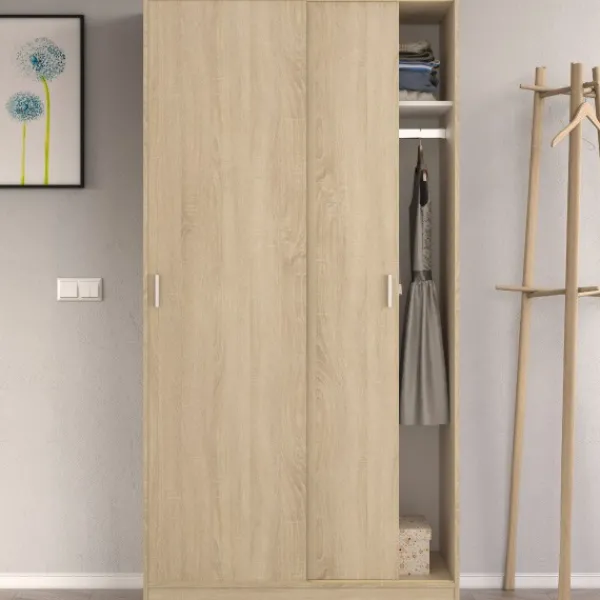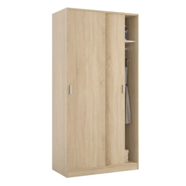Armario de 2 puertas correderas de 100cm, un modelo sencillo, práctico y funcional. Incluye balda y barra de colgar. Perfecto para cualquier rincón. En color roble canadian. ENVÍO GRATIS