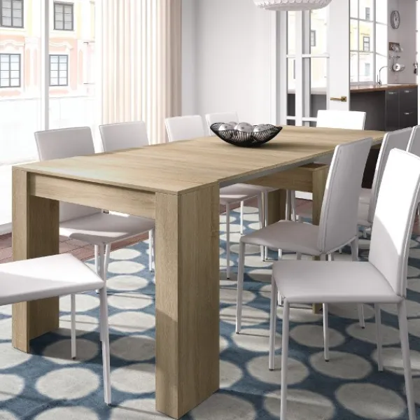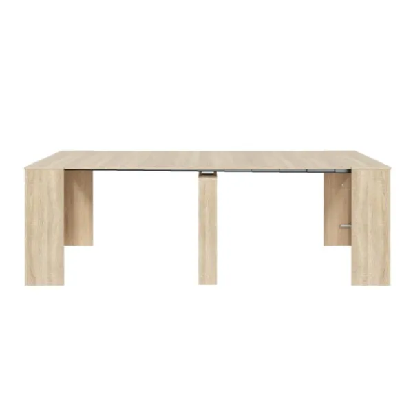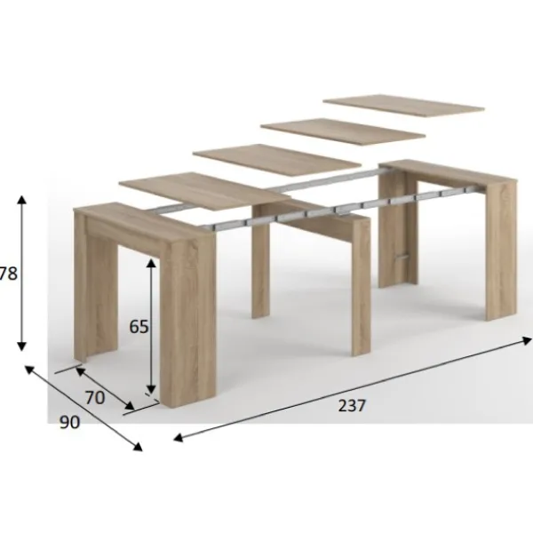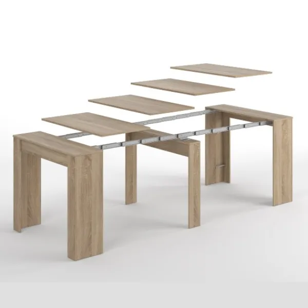 Mesa multifunción extensible con 5 posibles posiciones. El mueble más práctico y funcional de nuestro catálogo, ya que gracias a sus cinco posiciones puedes tener un recibidor o una gran mesa de comedor. En roble canadian. Disponible en más colores en la web. Muebles KIT. ENVÍO GRATIS