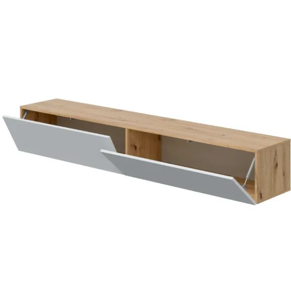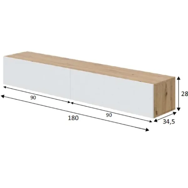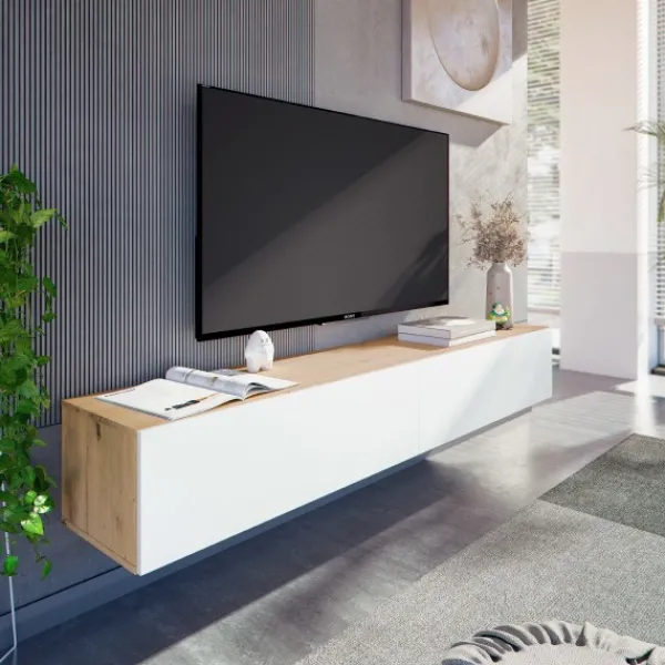 El mueble de televisión con 2 puertas de colgar modelo Kaway de 180cm es una opción sencilla, práctica y funcional. Un bajo de televisión ideal para salones pequeños y elegantes. Disponible en color roble y blanco. Mueble KIT.