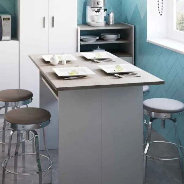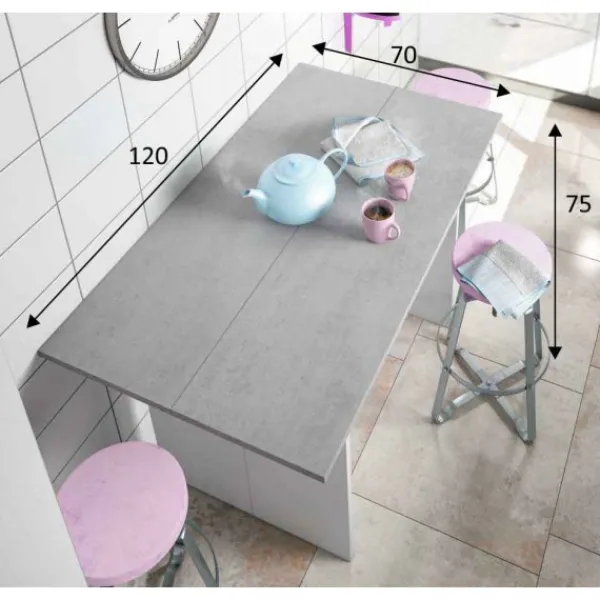 Mesa desplegable modelo Oggi de color cemento y blanco artik. Es una mesa auxiliar que puede servir de recibidor, mesita de cocina e infinitos usos más. Cuando está cerrada mide 35cm de profundo y cuando se abre llega a los 70cm. Súper útil y bonita.