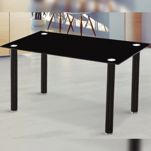 Mesa de comedor fija rectangular con tapa de cristal templado y patas de tubo de acero pintado de color negro.